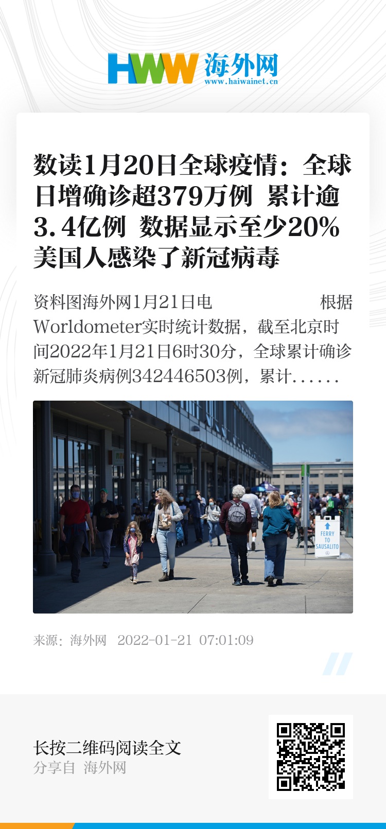 海外网1月21日电 根据Worldometer实时统计数据,截至北京时间2022年1月21日6时30分,全球累计确诊新冠肺炎病例342446503例,累计死亡病例5591385例。全球单日新增确诊病例3790871例,新增死亡病例9981例。