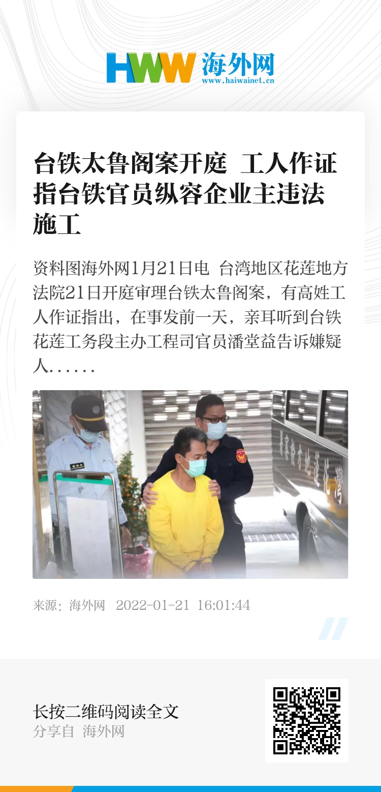 海外网1月21日电 台湾地区花莲地方法院21日开庭审理台铁太鲁阁案,有高姓工人作证指出,在事发前一天,亲耳听到台铁花莲工务段主办工程司官员潘堂益告诉嫌疑人李义祥,“你要做就做,我当作没看到”,证实台铁官员纵容涉事企业主违法赶工。