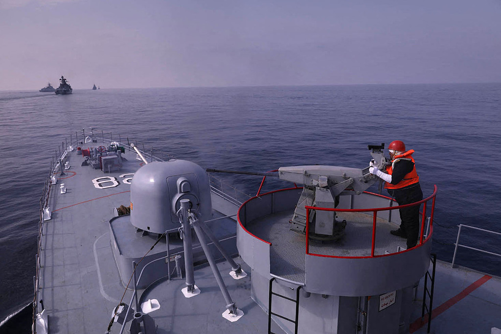 当地时间2022年1月19日,根据中国、伊朗、俄罗斯三国军队共识,中伊俄三国海军于1月18日至20日位阿曼湾海域举行第二次海上联合军事演习。图片来源:人民视觉