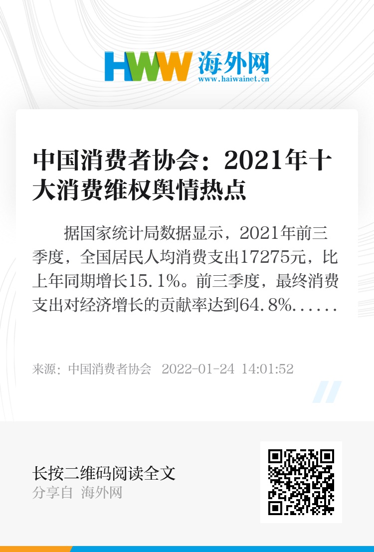 2022新年伊始,中国消费者协会(以下简称“中消协”)联合人民网舆情数据中心,基于大数据与舆情社会影响力测算结果,共同梳理出“2021年十大消费维权舆情热点”,分别是:“车顶维权”事件暴露车企服务漏洞;教培机构频现跑路及退费风波;个别跨国企业无理拒绝新疆产品侵害消费者权益;未成年人线上线下过度消费问题频出;餐饮品牌门店食品安全事件受关注;消费者个人信息“裸奔”问题突出;视频平台“超前点播”被指“套路”接连取消;“网红”商品被指过度营销;奢侈品牌中外退货政策“双标”引不满;电商平台“宠物活体盲盒”存侵权风险。我们希望通过梳理话题列表和解读热点,引起社会各界对消费维权问题的关注,进一步促进消费潜力释放,更好发挥消费对经济增长的基础性作用。