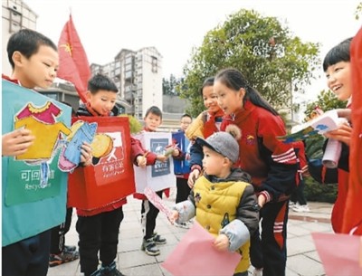 湖南省怀化市通道侗族自治县礼雅小学学生引导孩子们学习垃圾分类知识。