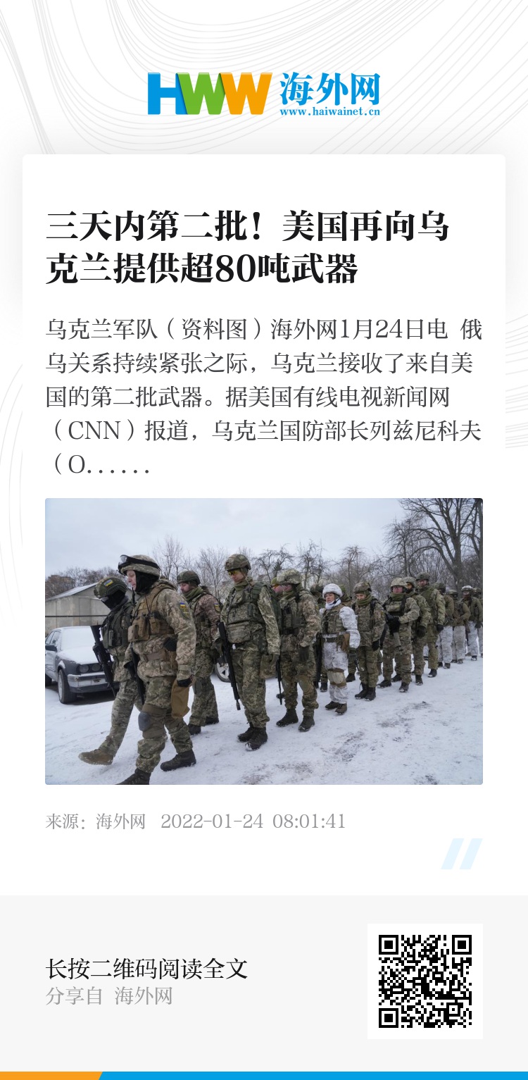 海外网1月24日电 俄乌关系持续紧张之际,乌克兰接收了来自美国的第二批武器。