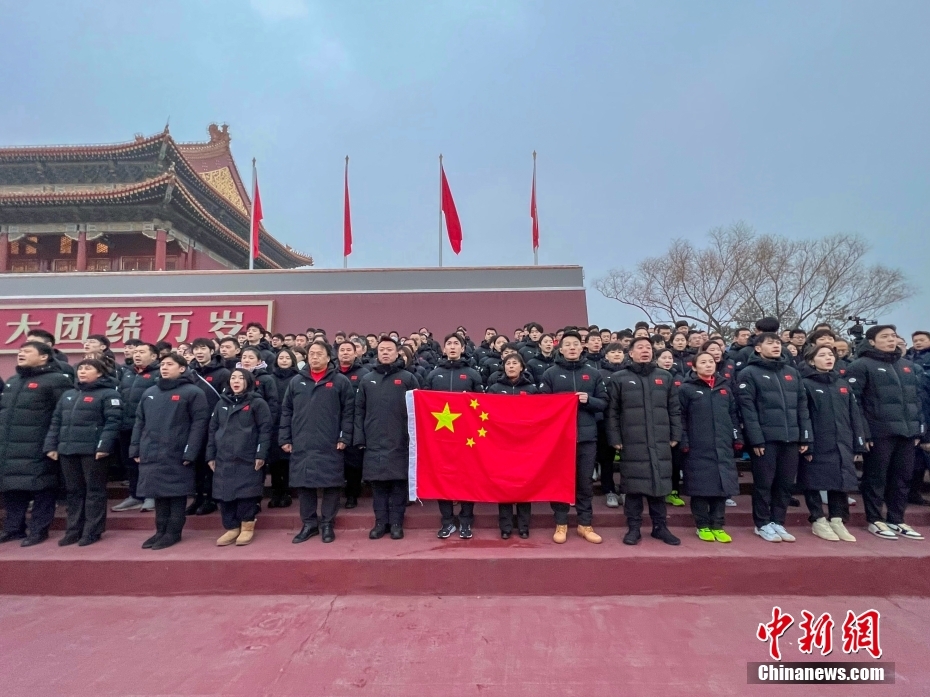 1月25日,北京冬奥会中国体育代表团部分成员来到天安门广场观看升国旗仪式,并宣誓出征。图为中国体育代表团部分成员宣誓出征北京冬奥会。 中新社发 国家体育总局冬季运动管理中心 供图