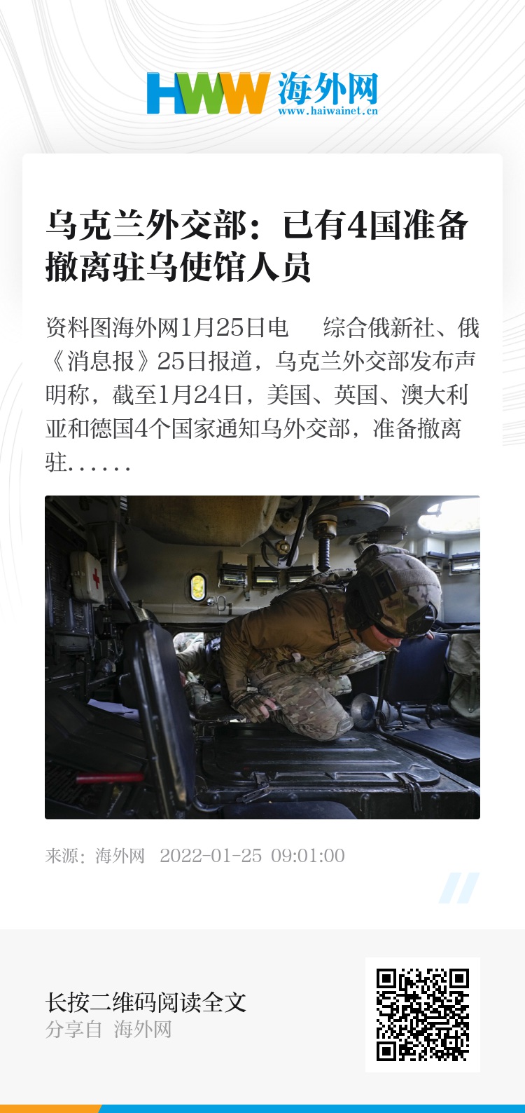 海外网1月25日电 综合俄新社、俄《消息报》25日报道,乌克兰外交部发布声明称,截至1月24日,美国、英国、澳大利亚和德国4个国家通知乌外交部,准备撤离驻乌使馆工作人员及家属。
