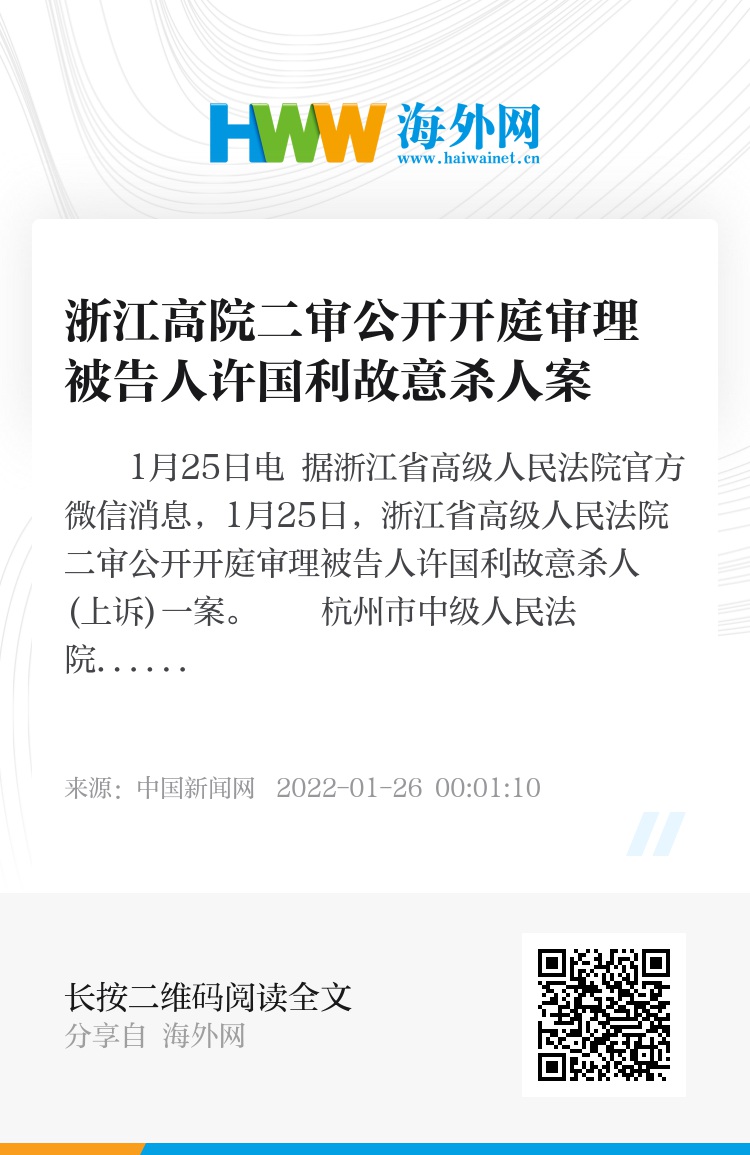 中新网1月25日电 据浙江省高级人民法院官方微信消息,1月25日,浙江省高级人民法院二审公开开庭审理被告人许国利故意杀人(上诉)一案。