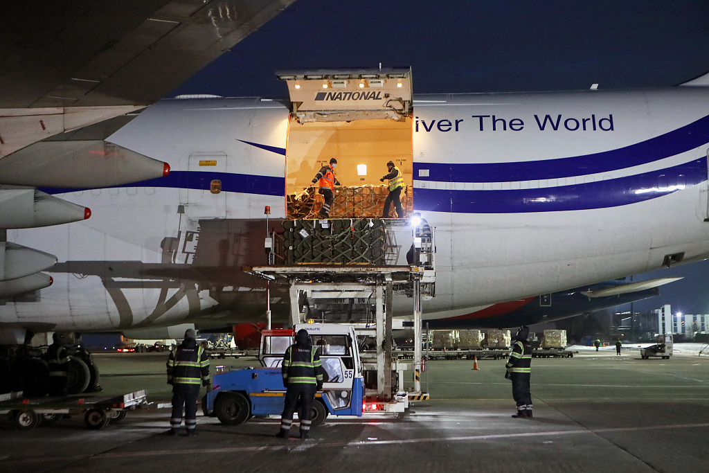 ​当地时间1月25日,乌克兰首都基辅博里斯皮尔国际机场,乌克兰接收来自美国方面的武器装备。图片来源:人民视觉