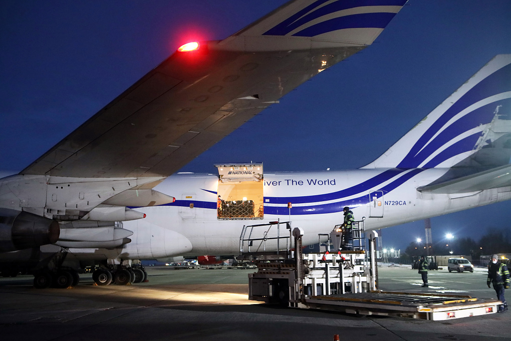 ​当地时间1月25日,乌克兰首都基辅博里斯皮尔国际机场,乌克兰接收来自美国方面的武器装备。图片来源:人民视觉