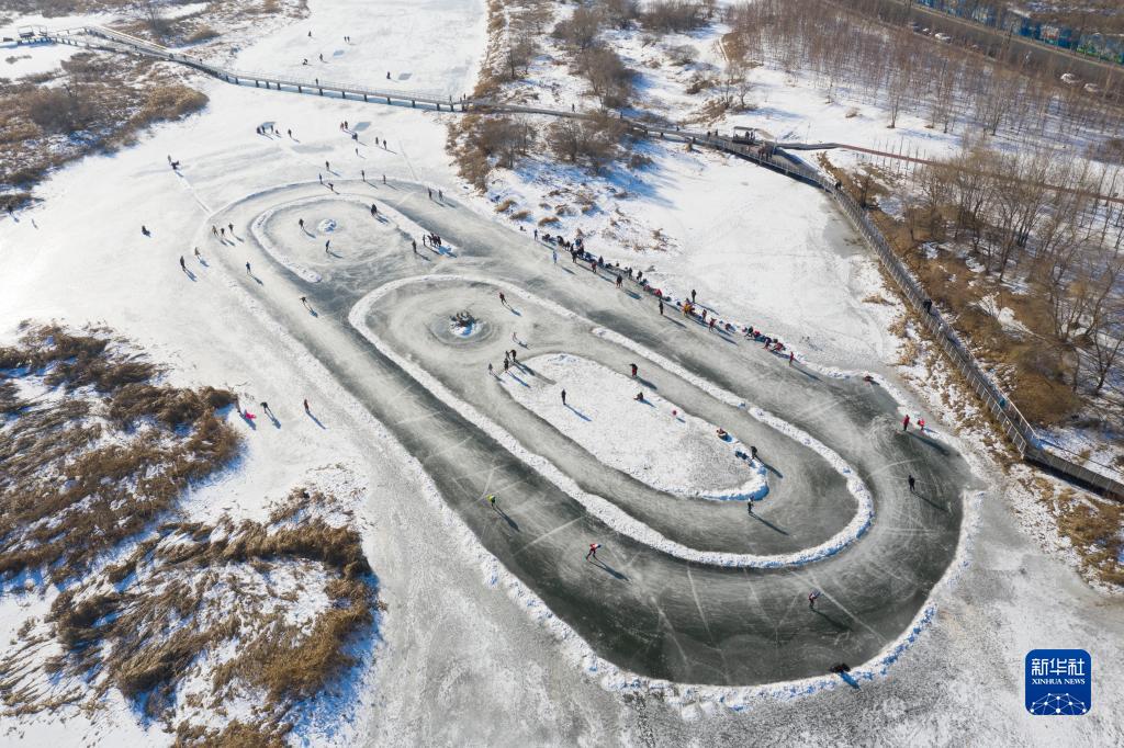 图为市民在哈尔滨市松北区一冰场上滑冰(2021年12月6日摄,无人机照片)。