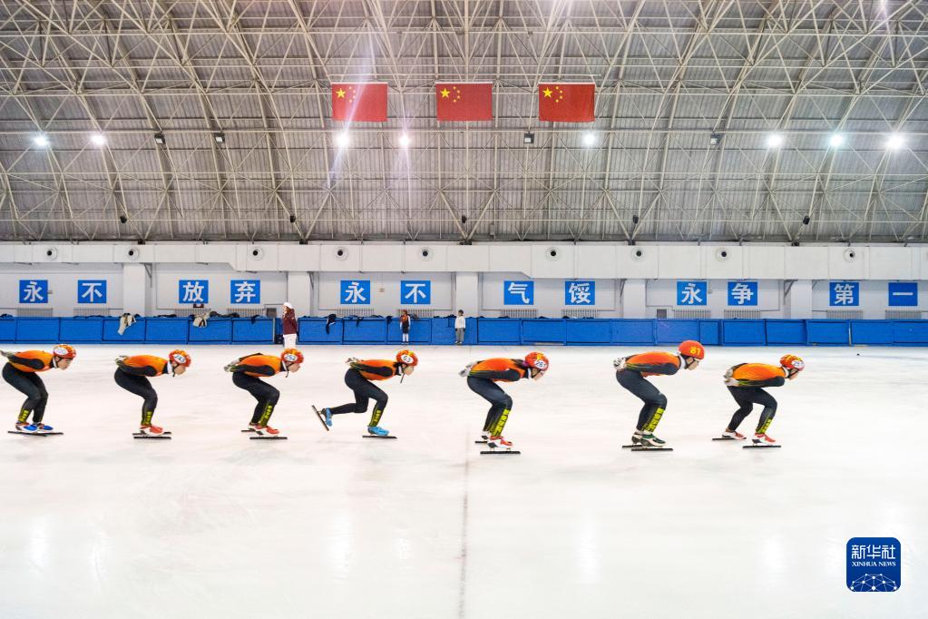 图为在七台河体育中心,七台河职业学院短道速滑训练中心的孩子们在进行训练(1月10日摄)。