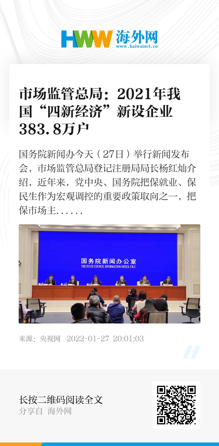 新技术、新产业、新业态、新模式快速发展,成为我国经济发展的新亮点。2021年,我国“四新经济”新设企业383.8万户,同比增长15.8%,占新设企业总量的42.5%。