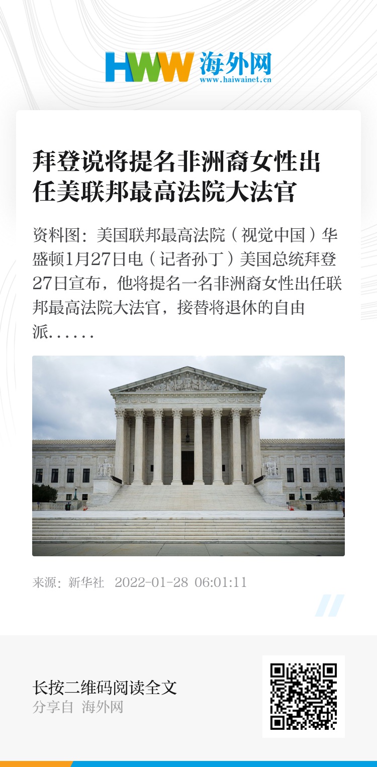 新华社华盛顿1月27日电(记者孙丁)美国总统拜登27日宣布,他将提名一名非洲裔女性出任联邦最高法院大法官,接替将退休的自由派大法官斯蒂芬·布雷耶。