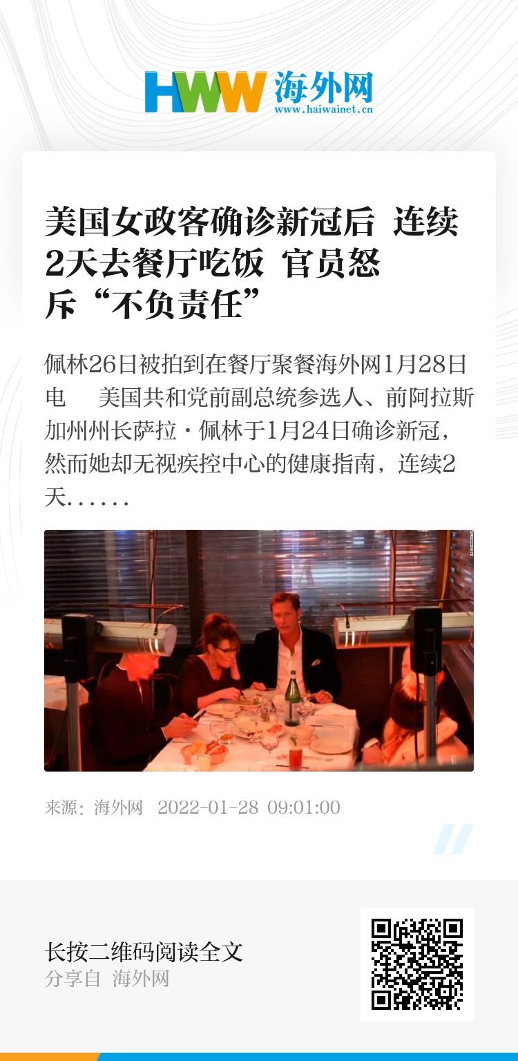 综合CNN和NBC新闻报道,当地时间1月26日,佩林被发现在纽约州曼哈顿一家餐厅的户外餐桌上用餐,且在公共场所未戴口罩。此时距离她确诊仅过去2天,之前她曾坚称“死也不打疫苗”。而在前一天(25日),她还光顾过一家知名的意大利餐厅。