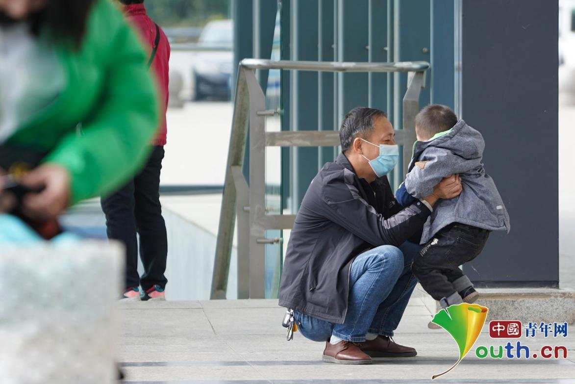 2022年1月18日,厦门北站进站口前,一对父子正在嬉戏玩耍。 张海根 摄