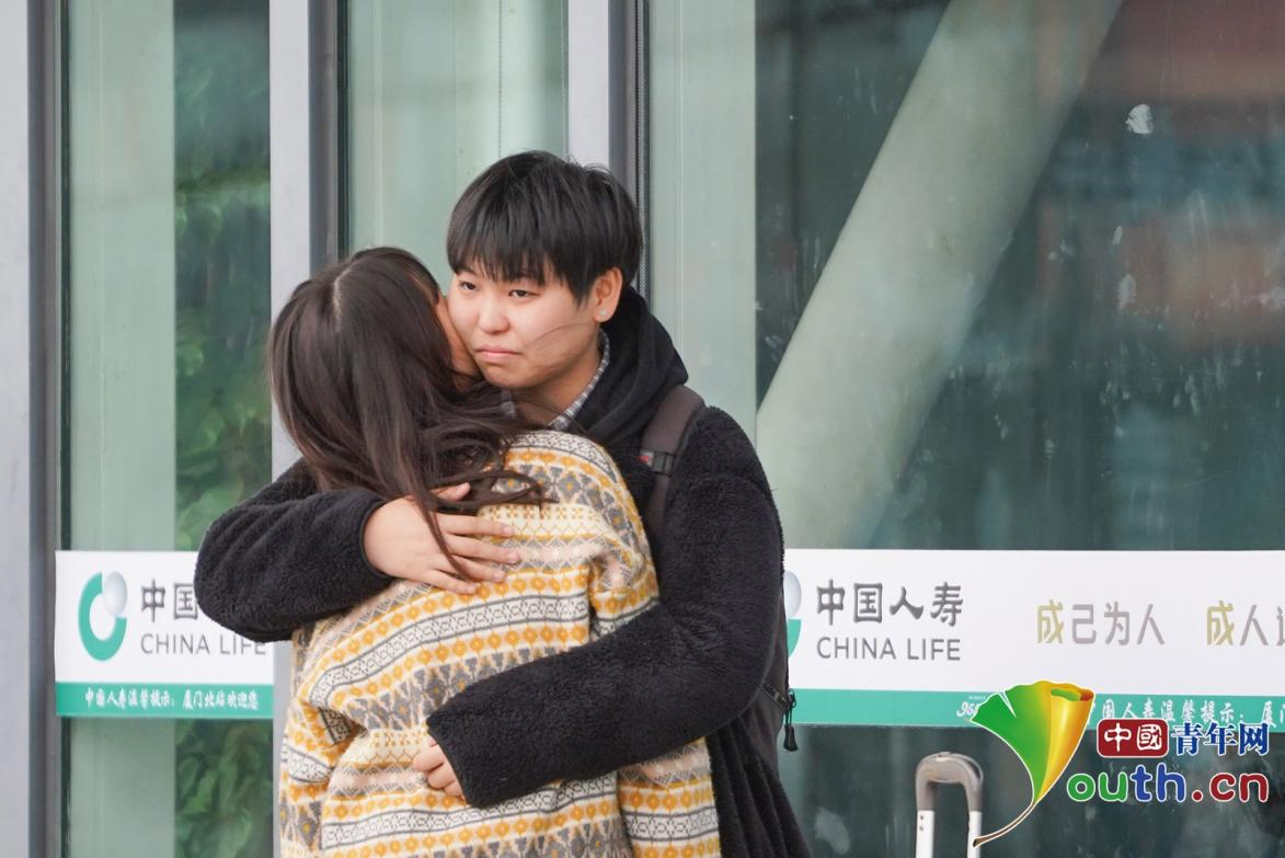 2022年1月20日,一对情侣在厦门北站外依依不舍相拥告别。 张海根 摄
