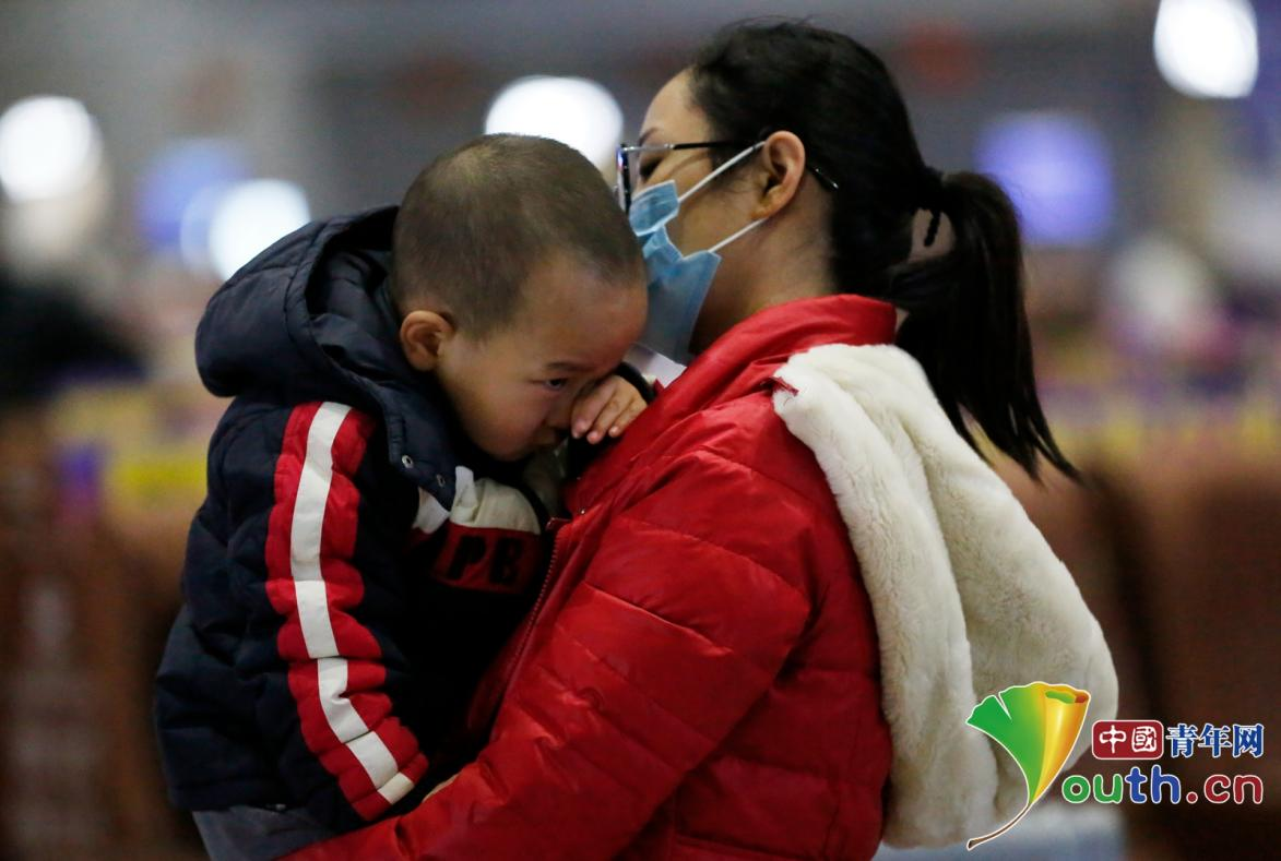 2022年1月27日,一位母亲抱着孩子前往南昌车站候车,孩子困了揉着眼睛。丁波 摄