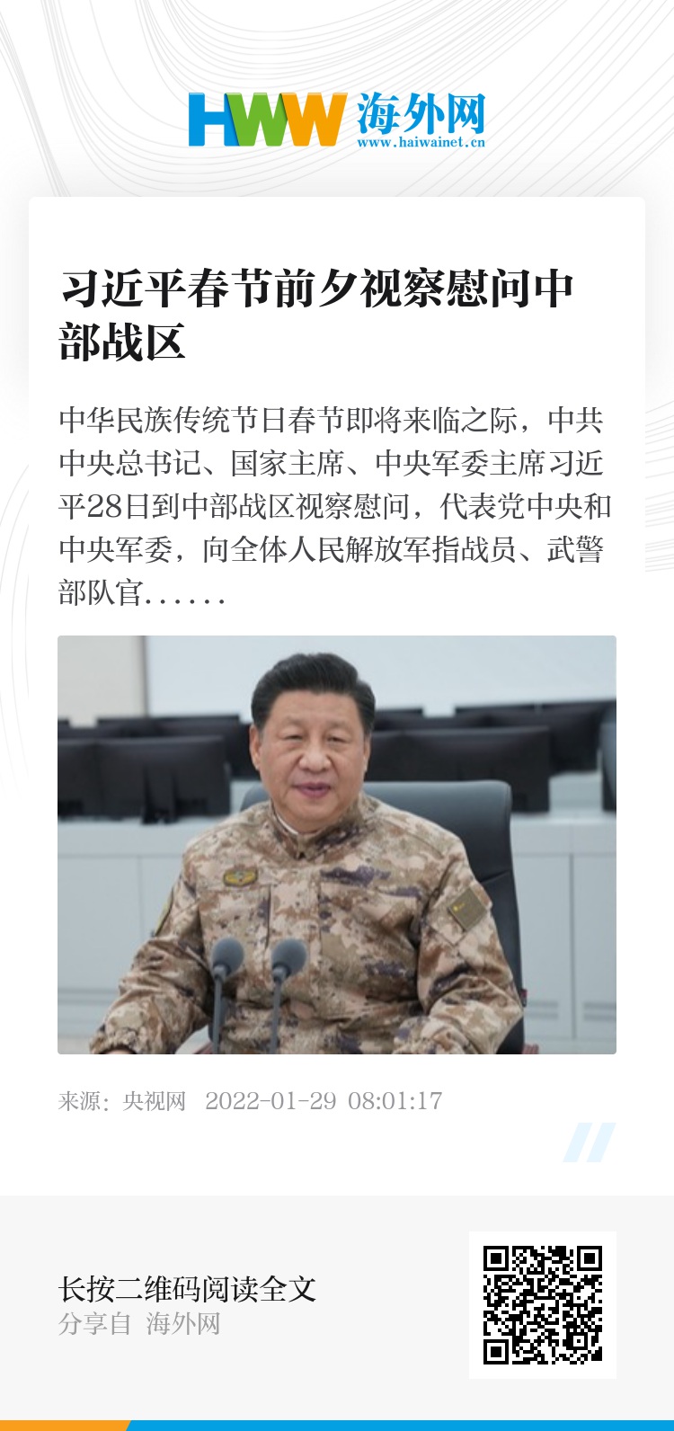 原标题:习近平春节前夕视察慰问中部战区 向全体人民解放军指战员武警部队官兵军队文职人员民兵预备役人员致以新春祝福