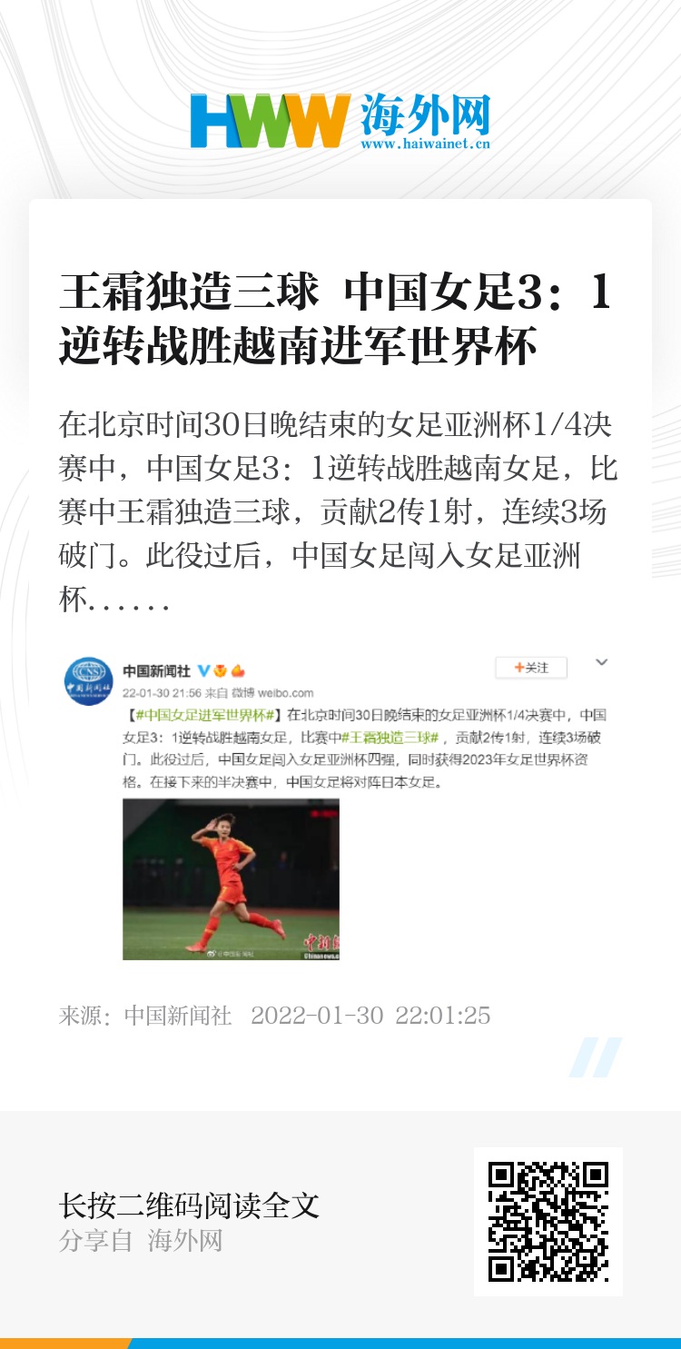 在北京时间30日晚结束的女足亚洲杯1/4决赛中,中国女足3:1逆转战胜越南女足,比赛中王霜独造三球,贡献2传1射,连续3场破门。此役过后,中国女足闯入女足亚洲杯四强,同时获得2023年女足世界杯资格。在接下来的半决赛中,中国女足将对阵日本女足。