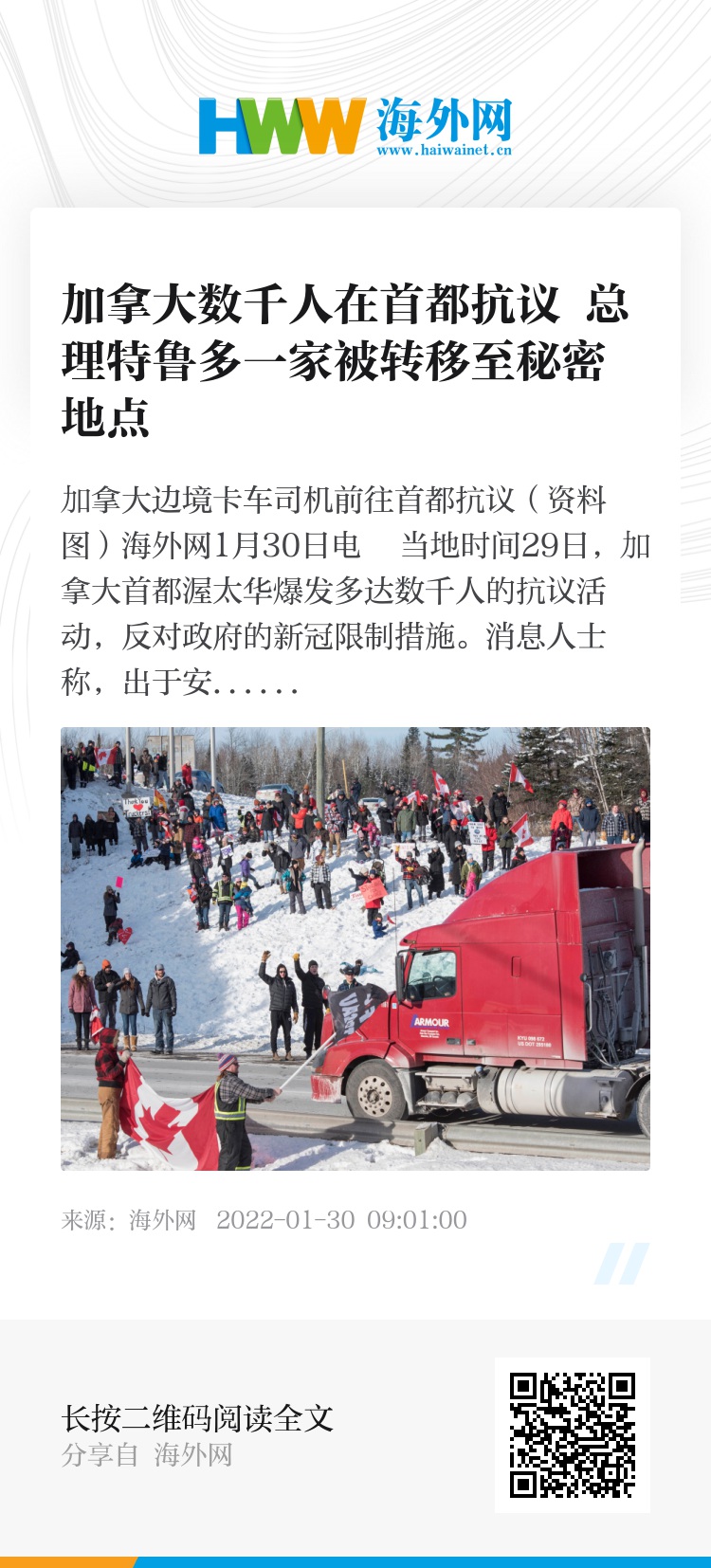 外媒指出,此次抗议活动中的不少人不满1月15日生效的一项新规定,该规定要求进入加拿大的卡车司机完全接种新冠疫苗,而这或导致16万边境卡车司机中有3.2万人离岗。23日起,加拿大边境卡车司机组车队驶向首都渥太华抗议,车队长达70公里,成员中也不乏来自美国的抗议司机。(海外网 张霓)
