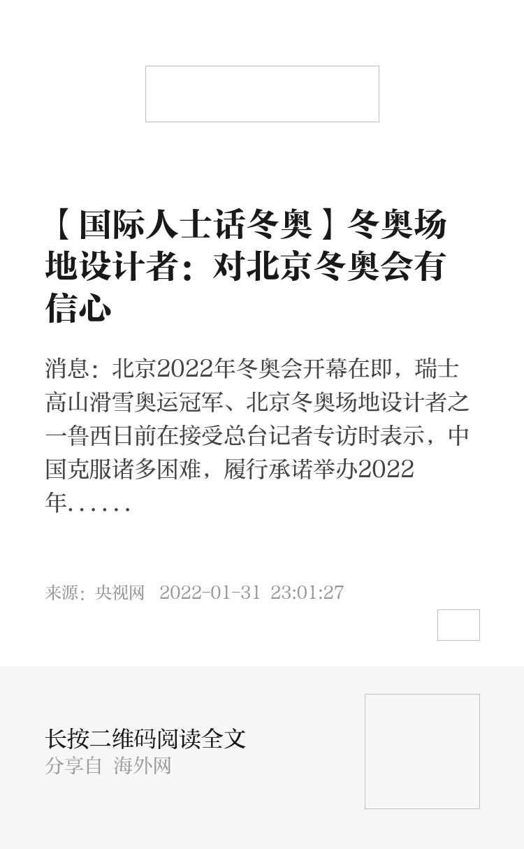 北京冬奥场地设计者 鲁西:如果一届奥运会被推迟或取消,我想这对每位运动员来说都是一个大问题。所以我认为体育界人士非常感谢北京冬奥会的举办,冬奥会在(北京)举行,对整个世界都非常重要,我想对中国人民说,祝福北京2022年冬奥会圆满成功。