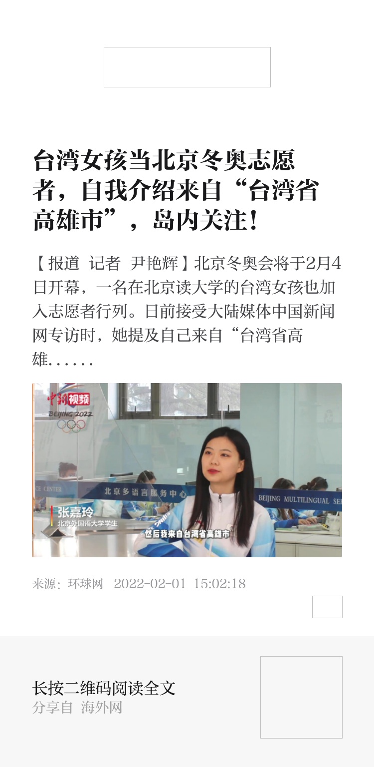 台湾“ETtoday新闻云”报道称,张嘉玲目前就读北京外国语大学,是一名硕一的研究生,她今年加入北京冬奥会的赛事服务志愿者行列,并表示自己来自“台湾省高雄市”。她还说,受到疫情影响,已经很久没有回台湾过年,很怀念以前除夕夜和亲戚家人一起围炉吃汤圆,还有在巷子里和大家一起放烟火的氛围。