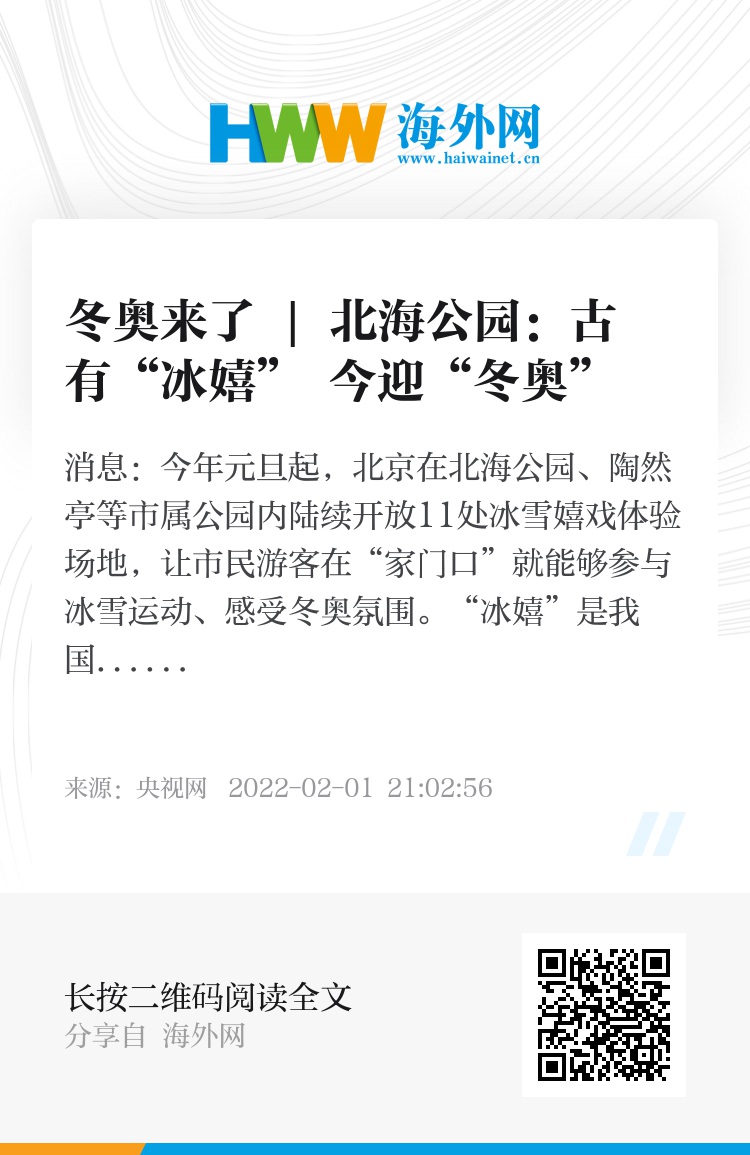 央视网消息:今年元旦起,北京在北海公园、陶然亭等市属公园内陆续开放11处冰雪嬉戏体验场地,让市民游客在“家门口”就能够参与冰雪运动、感受冬奥氛围。“冰嬉”是我国传统冰上运动,北海曾是清代“冰嬉”表演的重要场所之一。当激情冬奥会遇上喜庆的春节,会擦出怎样的火花?让我们跟随记者的镜头,走进北海公园,逛公园,上冰雪,迎冬奥。