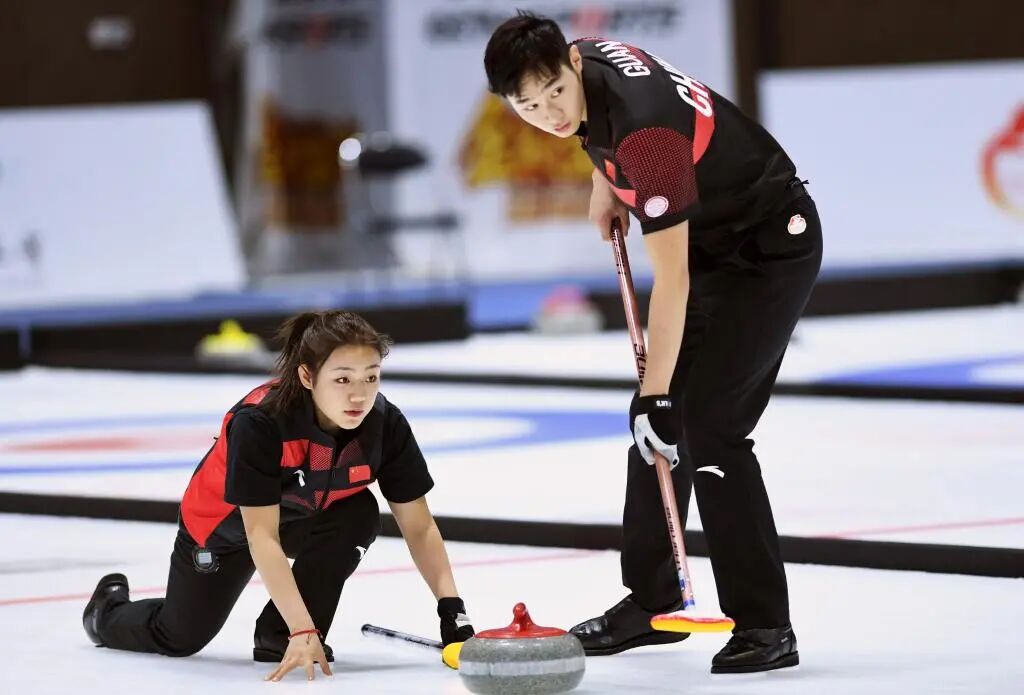 2021年10月6日,冰壶国家集训队队内对抗赛,韩雨(左)/关天琪在第11轮混双比赛中。新华社记者张龙 摄