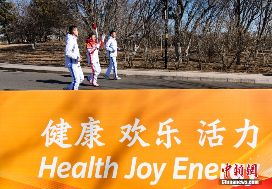 2月2日,北京2022年冬奥会火炬接力在北京奥林匹克森林公园开启。图为第105棒火炬手徐俊新在火炬传递中。中新社记者 侯宇 摄