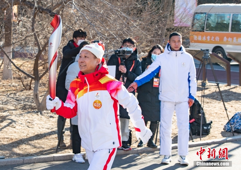 2月2日,北京2022年冬奥会火炬接力在北京奥林匹克森林公园开启。图为第35棒火炬手陈季华在火炬传递中。 中新社记者 侯宇 摄