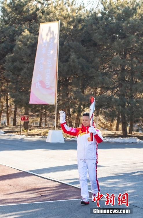 图为第34棒火炬手汪圣军在火炬传递中。 中新社记者 侯宇 摄