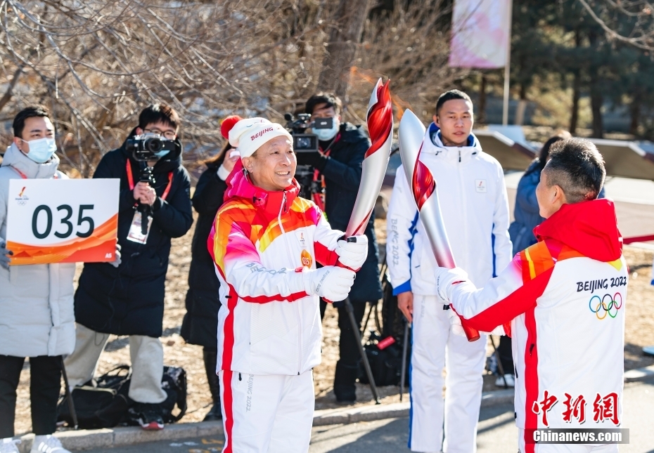 2月2日,北京2022年冬奥会火炬接力在北京奥林匹克森林公园开启。图为第35棒火炬手陈季华(前左)与第34棒火炬手汪圣军进行接力。 中新社记者 侯宇 摄