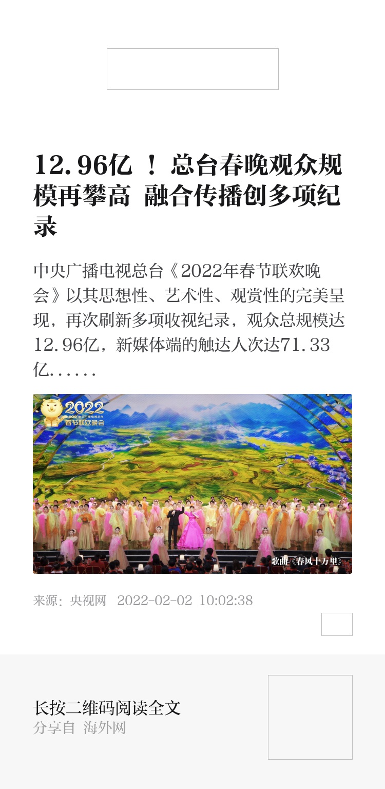 今年春晚新意盎然,获得海内外观众和媒体的广泛关注和普遍点赞,展现出无穷的创新活力。据统计,直播期间,通过电视、网络、社交媒体等多终端多渠道,2022年春晚海内外跨媒体受众总规模达12.96亿人。全国电视频道并机总收视率达22.01%,新媒体端直点播总触达人次71.33亿次,均高于去年水平。除夕当晚,全球170多个国家和地区超过650家媒体对春晚进行了直播报道。