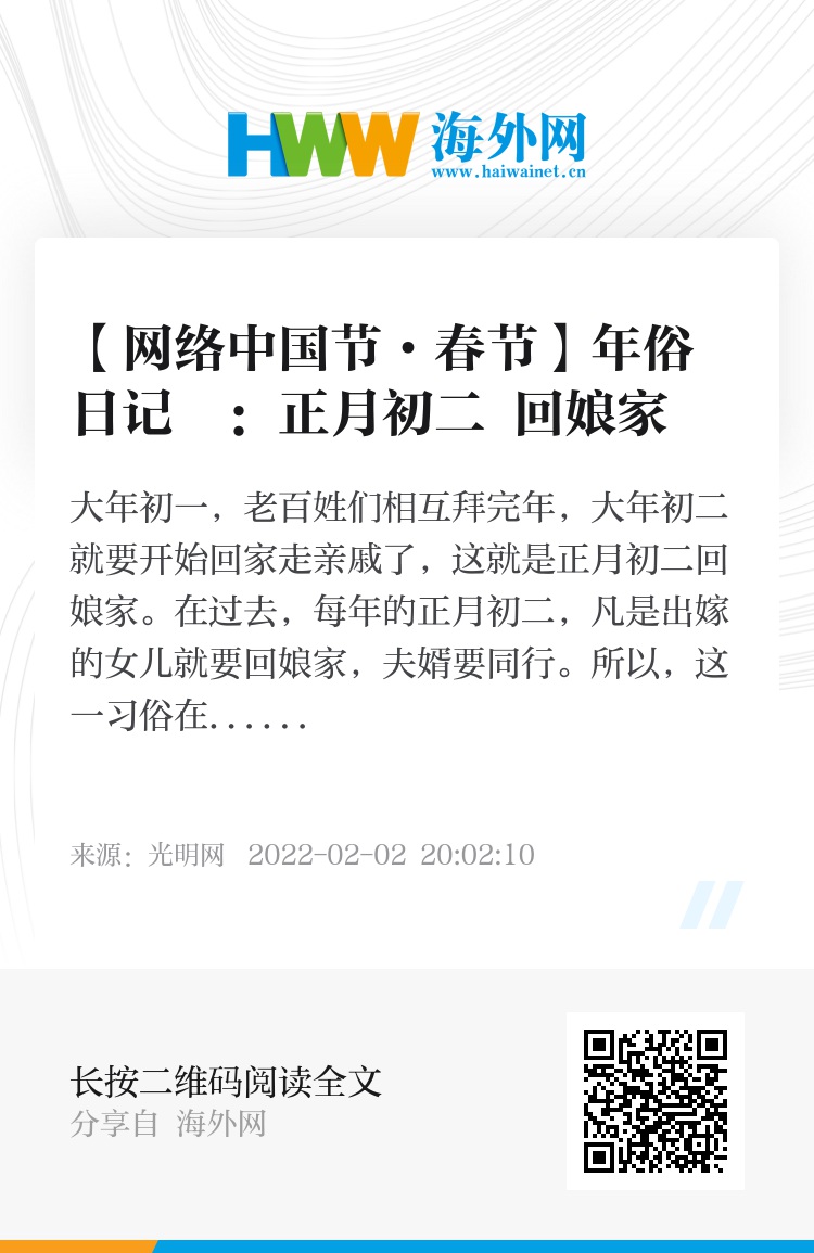 过去在民间,人们认为嫁出去的女儿在正月初一这天不能回门,回门会把娘家给吃穷,只有在正月初二以后才能回娘家。在台湾有这样的民谚:“有父有母初二三,无父无母门担担。”意思是说有父母的女儿,在正月初二以后,娘家人必然会接回去团圆,只有无父无母的女儿,没有亲人想念,娘家也就不派人来接了。还有一句谚语是这样说的:“正月初二路上看,尽是小生和小旦”,说的就是大年初二这一天,满大街都是提着礼物,准备随妻子回娘家的男子。