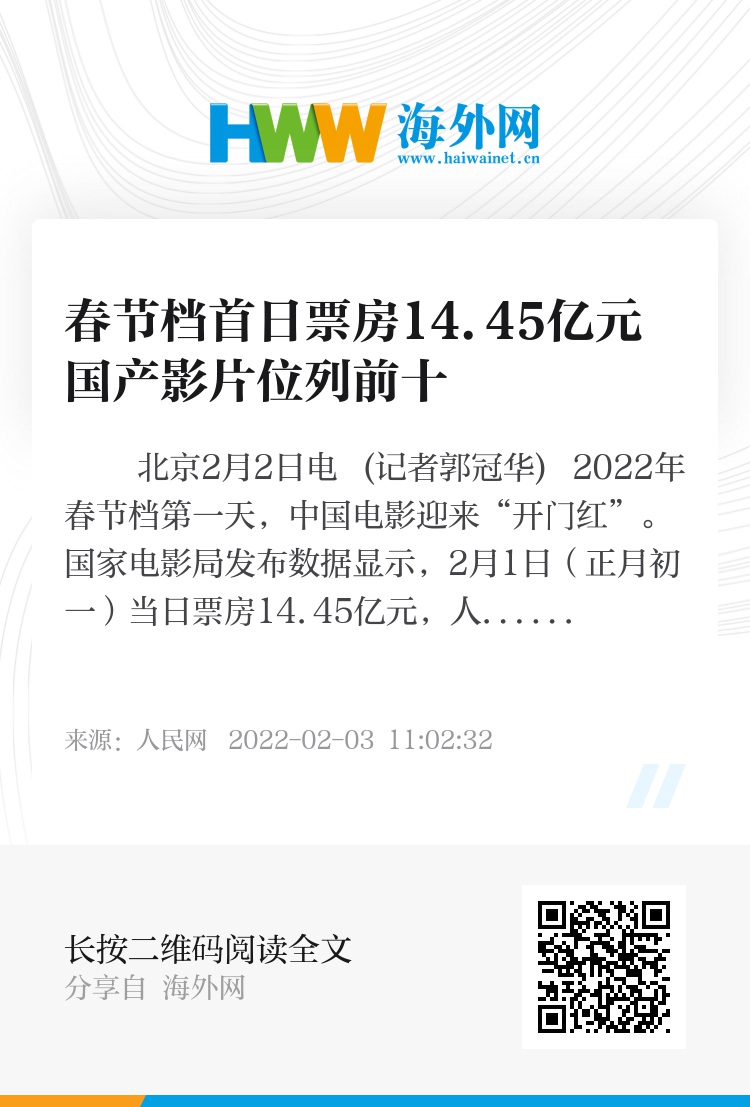 人民网北京2月2日电 (记者郭冠华) 2022年春节档第一天,中国电影迎来“开门红”。国家电影局发布数据显示,2月1日(正月初一)当日票房14.45亿元,人次2574.07万;其中国产影片票房14.44亿元,单日份额为99.99%。