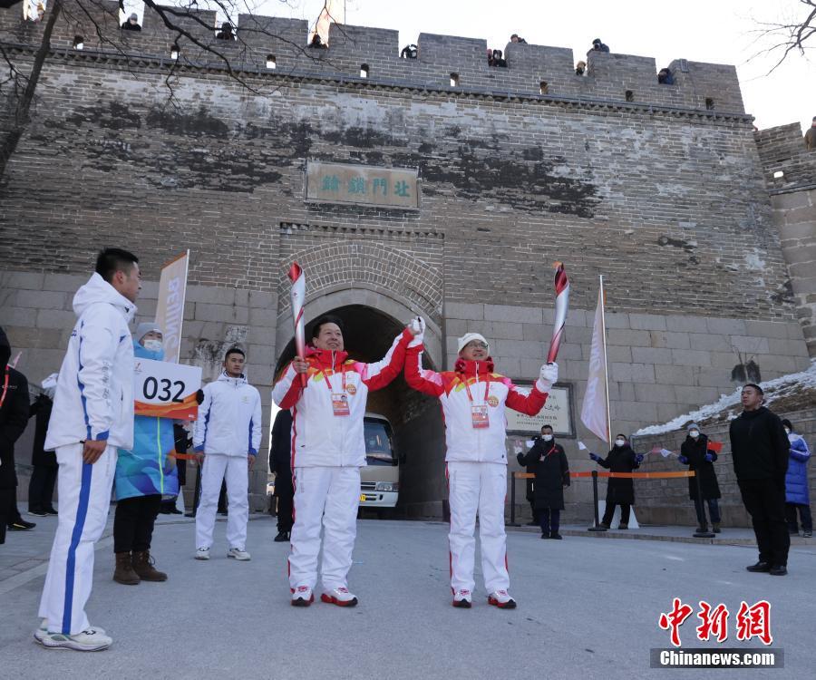 ​2月3日,北京冬奥会火炬在北京延庆八达岭长城传递。图为第31棒火炬手与第32棒火炬手进行火炬传递。 中新社记者 杨可佳 摄