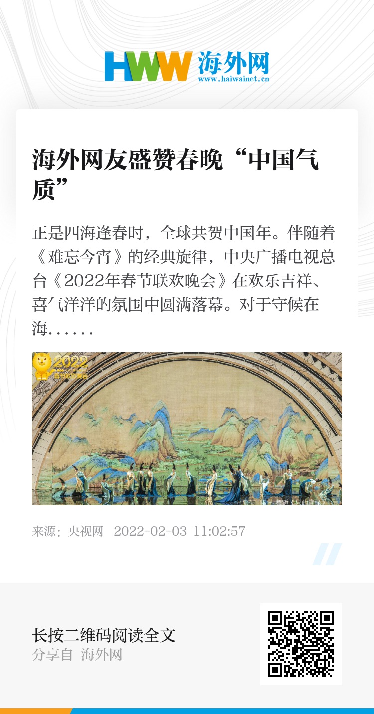 正是四海逢春时,全球共贺中国年。伴随着《难忘今宵》的经典旋律,中央广播电视总台《2022年春节联欢晚会》在欢乐吉祥、喜气洋洋的氛围中圆满落幕。对于守候在央视网海外社交平台上收看春晚直播的、来自全球数十个国家和地区的近3500万名海外网友来说,今年春晚尤其令他们耳目一新、拍案叫绝的,当属巧妙融合尖端技术手段、时代审美追求和中华文化底蕴的一系列创意节目。