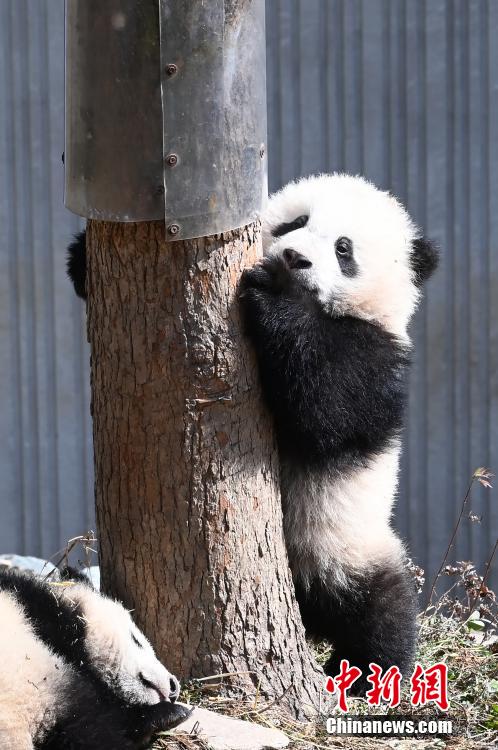 大熊猫“宝宝”的二仔在爬树。 安源 摄