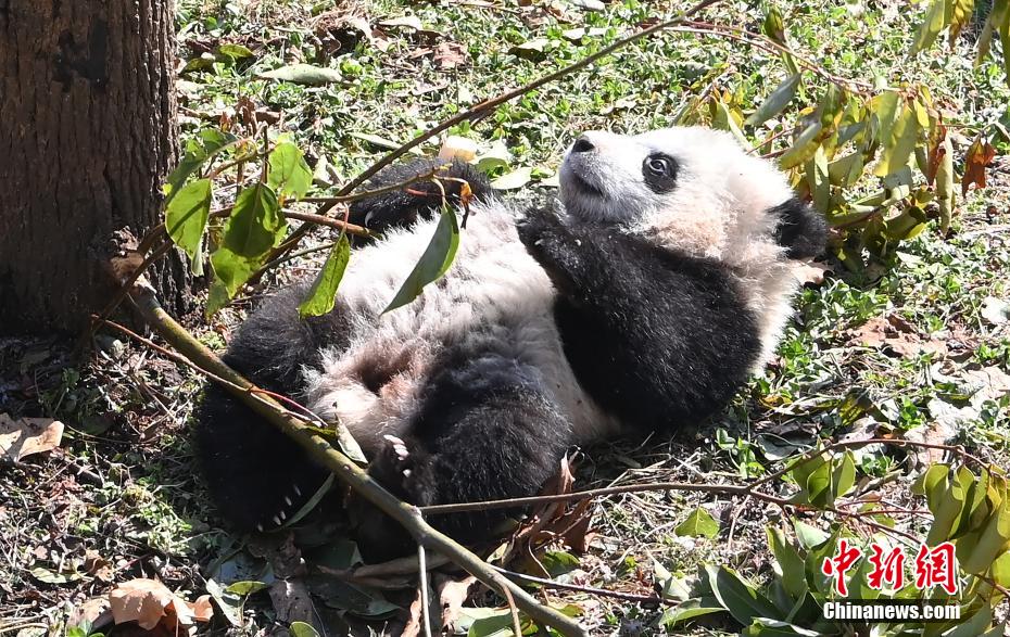 大熊猫“宝宝”的二仔在晒太阳。 安源 摄