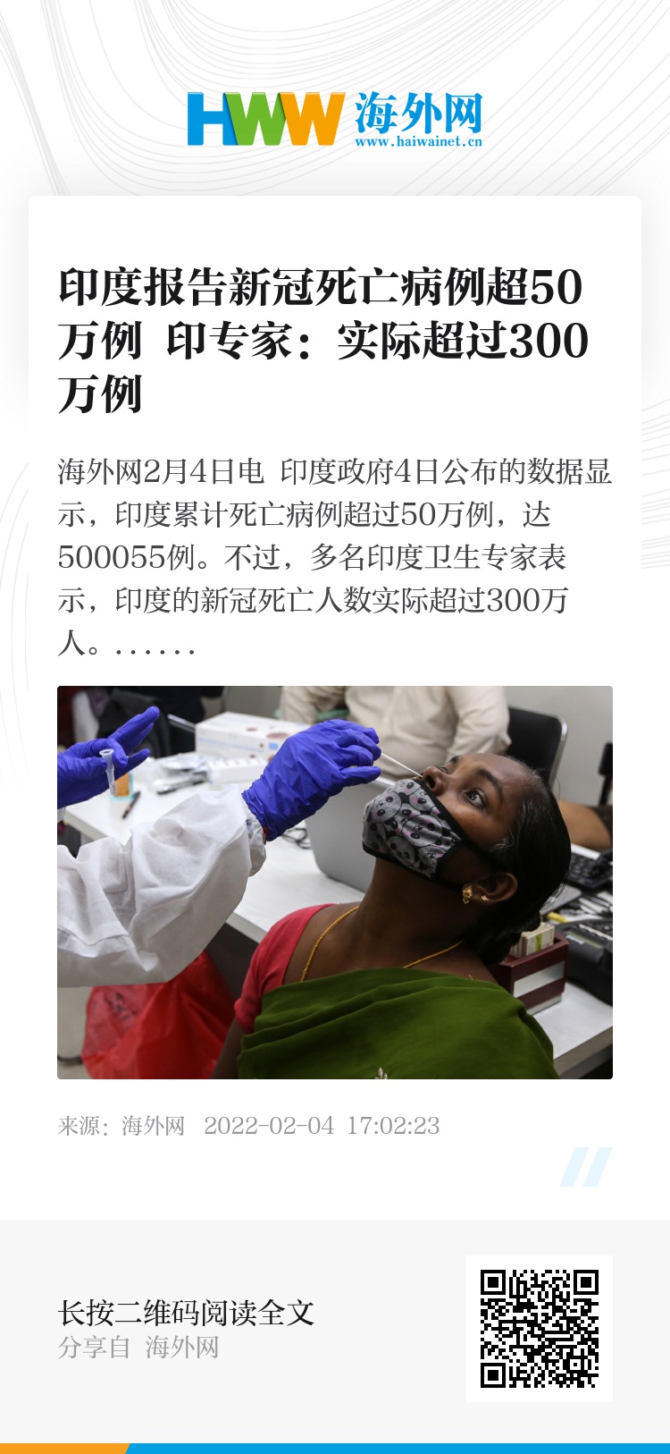 海外网2月4日电 印度政府4日公布的数据显示,印度累计死亡病例超过50万例,达500055例。不过,多名印度卫生专家表示,印度的新冠死亡人数实际超过300万人。