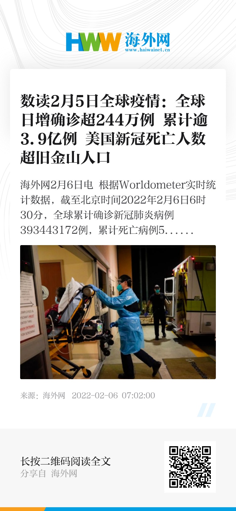 海外网2月6日电 根据Worldometer实时统计数据,截至北京时间2022年2月6日6时30分,全球累计确诊新冠肺炎病例393443172例,累计死亡病例5751072例。全球单日新增确诊病例2444137例,新增死亡病例10113例。