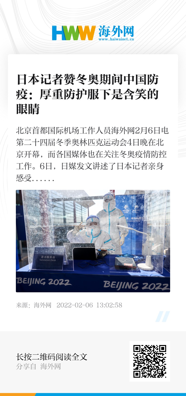 海外网2月6日电 第二十四届冬季奥林匹克运动会4日晚在北京开幕,而各国媒体也在关注冬奥疫情防控工作。6日,日媒发文讲述了日本记者亲身感受到的中国检疫情况,并特别赞道:“全都是亲切的工作人员,厚重防护服下是一双双含笑的眼睛”。