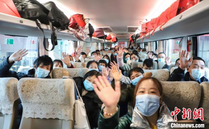 中新网成都2月7日电(王爵 贺樊丽)6日,111名广安武胜籍农民工经过体温检测、健康扫码等流程后,乘坐“点对点、一站式”返岗专车赴广东东莞、深圳龙岗等地务工。