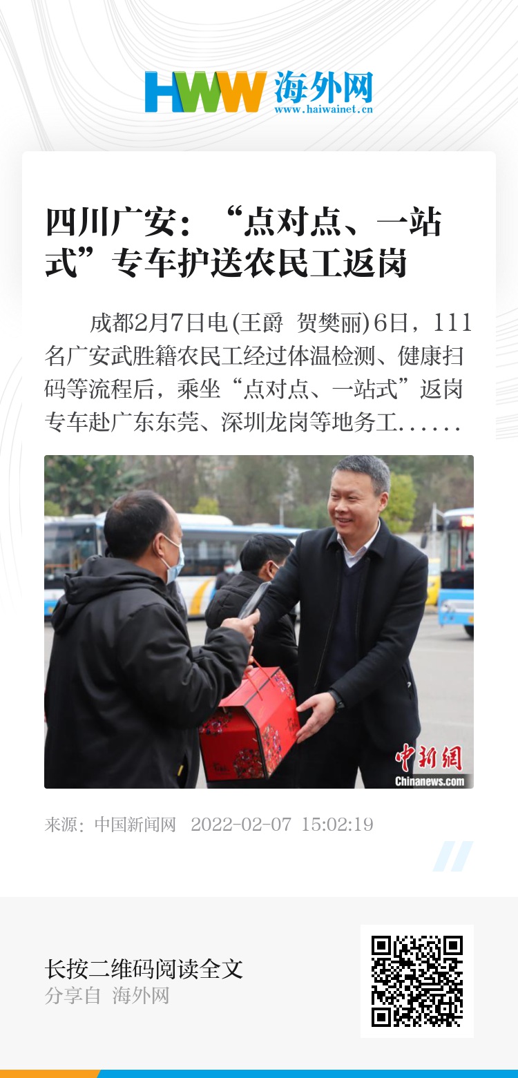 “2月5日,首批搭乘‘点对点、一站式’返岗专车的89名农民工,已于6日抵达目的地返岗务工。当前,广安各县(市、区)将结合农民工返岗需求陆续谋划组织开行返岗专车。”广安市人力资源和社会保障局相关负责人严勇说,为统筹做好疫情防控和农民工返岗务工出行服务,广安市各级人社部门都专门成立了农民工外出务工服务工作组,对返乡农民工务工地点、返岗时间、节后就业意愿、出行方式等进行了全面摸排,并通过与务工集中地所在企业和政府部门积极对接,提前谋划“点对点、一站式”直达返岗运输服务,帮助农民工错峰安全返岗。