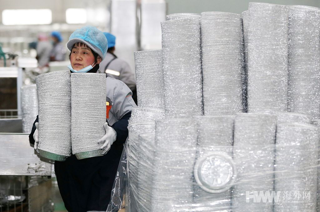2022年2月7日,工人在安徽省淮北市濉溪经济开发区一家铝箔餐盒加工企业生产车间赶制出口订单。(供图:视觉中国)