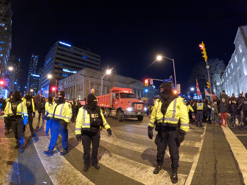 当地时间2022年2月5日晚,加拿大多伦多,在警方交通管制下,反对新冠疫苗强制接种的示威车队在市中心一个路口堵塞。该项示威在渥太华已持续逾一周,并蔓延至加拿大多个大城市。但社会舆论对这一示威活动的反感情绪正在上升,当局也开始逐步出手施控。(图:澎湃影像 中新社记者 余瑞冬 摄)