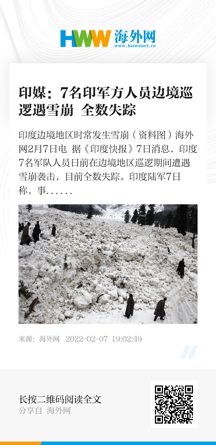 海外网2月7日电 据《印度快报》7日消息,印度7名军队人员日前在边境地区巡逻期间遭遇雪崩袭击,目前全数失踪。