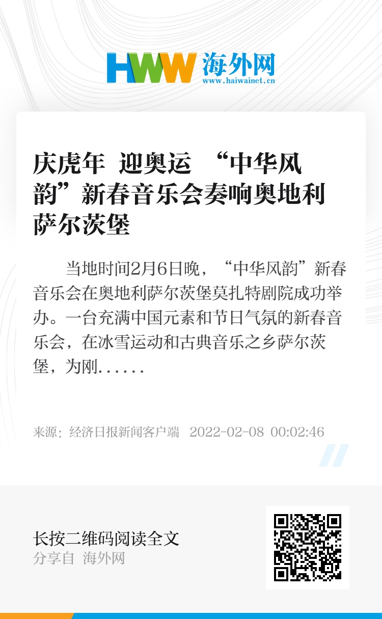 奥中文化交流协会会长常凯介绍说,“中华风韵”是中国对外文化集团有限公司打造的高端对外文化交流品牌,旨在推送中国舞台表演艺术精品力作登陆世界各国主流剧院,不断提升中华文化的国际影响力。此次在萨尔茨堡举办的新春音乐会是“中华风韵”品牌首次亮相奥地利。莫扎特剧院是举世闻名的萨尔茨堡艺术节主场,曾上演过众多欧洲名曲名剧,历史文化沉淀深厚。相信萨尔茨堡“中华风韵”音乐会将进一步促进中奥两国文化交流与合作,为两国民间友好交往和相互了解作出新贡献。(经济日报驻维也纳记者 翁东辉)