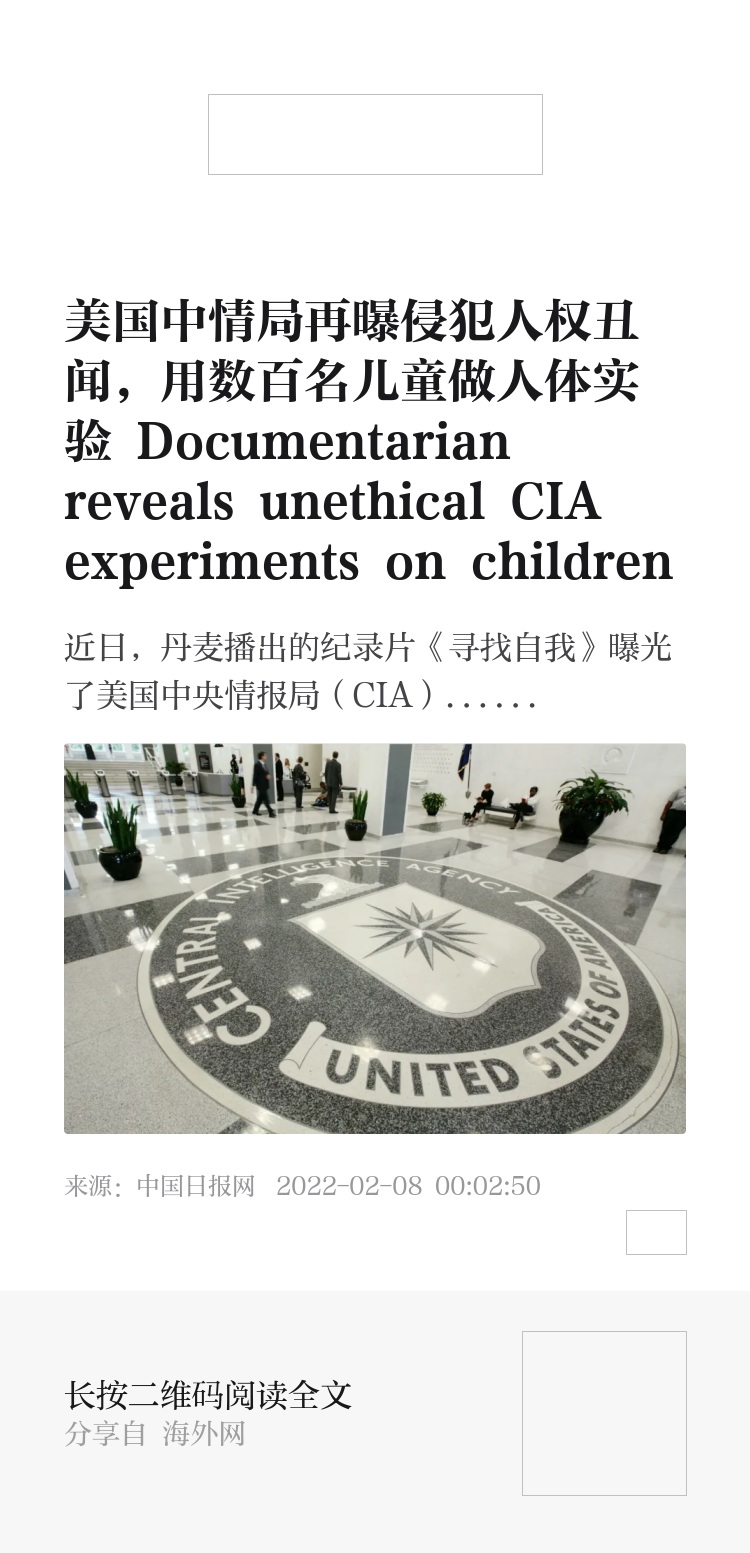 近日,丹麦播出的纪录片《寻找自我》曝光了美国中央情报局(CIA)在上世纪60年代针对311名丹麦儿童实施人体实验的“黑历史”。CIA曾秘密资助一项长达数十年的人体实验,311名儿童在不知情的情况下被用作精神分裂研究的试验品。