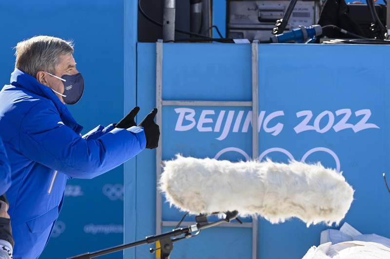 2月8日,河北张家口,2022北京冬奥会自由式滑雪女子大跳台决赛,国际奥委会主席巴赫现场观战。(图:东方IC)
