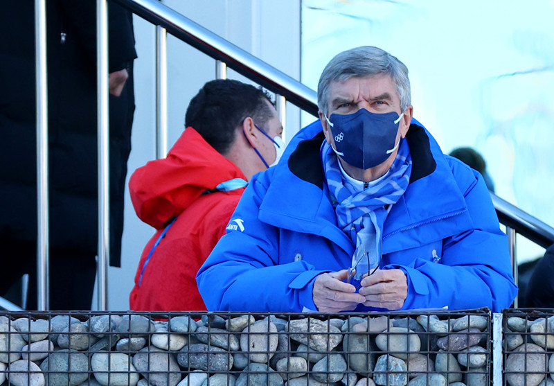 2月8日,河北张家口,2022北京冬奥会自由式滑雪女子大跳台决赛,国际奥委会主席巴赫现场观战。(图:东方IC)