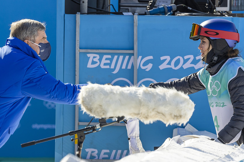 2月8日,河北张家口,2022北京冬奥会自由式滑雪女子大跳台决赛。国际奥委会主席巴赫祝贺谷爱凌夺冠。(图:东方IC)